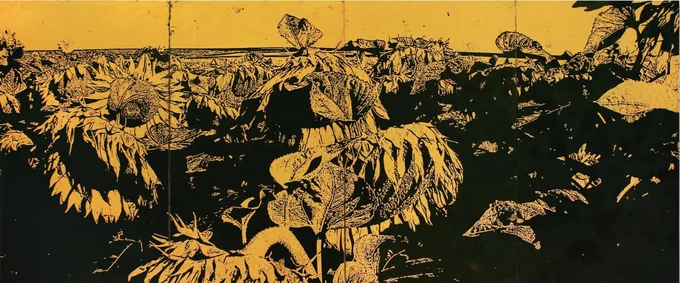«Країна соняшників» – це поліптих, який митець Данило Галкін створив на присвяту президентським виборам після Революції гідності. За задумом, соняшник втілює сіяння фальшивих обіцянок під час передвиборчих кампаній: його посіви виснажують ґрунт на наступні чотири роки так само, як нова влада виснажує український ландшафт на кілька років уперед, вважає митець.