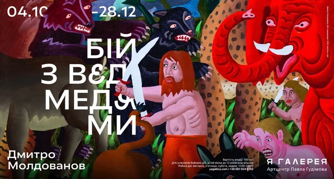 «Дикі, істеричні та кольорові танці» Дмитро Молдаванова, як описують у галереї, продовжують проєкт митця «Світоустрій». Те, що починалося як рефлексія на події в Україні, наповнилося новими образами – помаранчевими слонами, зебрами й зеленими левами.