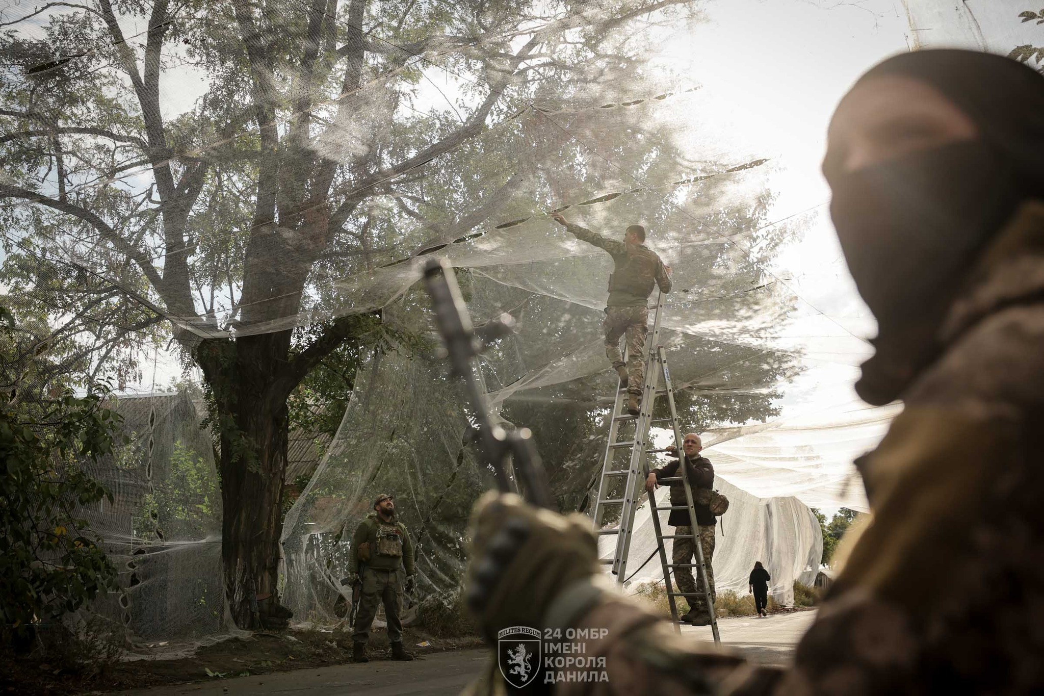 «Сітки — це вживане агроволокно, як жартують самі бійці, „з бельгійських грядок“», — розповіли у бригаді.