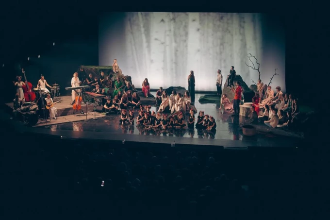 Також ми поставили у Франції «Лісову пісню» за драмою-феєрією Лесі Українки разом із театром Théâtre du Préau та його режисеркою Люсі Береловіч, яка вперше приїхала в Україну у 2015 році й поставила з нами «Антігону». Ми зробили матеріал і віддали його в консерваторію дітям, щоб вони розібрали музику, пісні – теж дитячому хору, танець – теж дітям. Це тривало рік, поки йшла робота над музикою й танцем. За три дні до премʼєри ці всі гурти прийшли на одну сцену – і ми окремо з усіма відрепетирували. Урешті вийшла вистава із 70 людьми на сцені – і це працювало. Це все французькою мовою – ми взяли старий переклад, як Леся Українка звучала би тоді – а пісні українською у виконанні дітей.