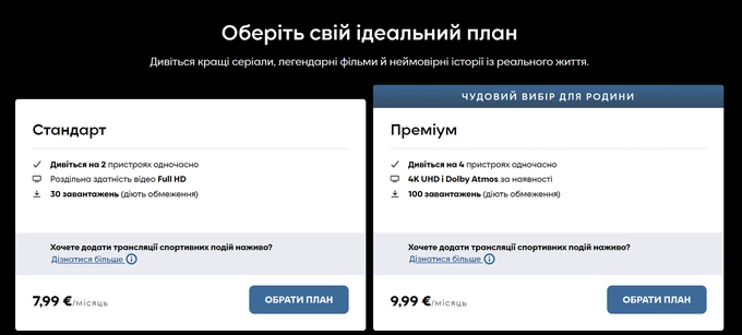 - «Преміум» матиме підтримку на чотирьох пристроїв одночасно у 4K UHD якості й пропонуватиме завантажувати до 100 епізодів. Ціна – 9,99 євро на місяць [близько 490 гривень].