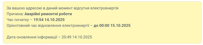 Ми перевірили інформацію щодо відключення у Голосіївському районі на офіційному сайті ДТЕК. Зокрема пишуть, що тривають аварійні ремонтні роботи. Орієнтовно електрику відновлять близько опівночі, однак ремонт може тривати й довше.
