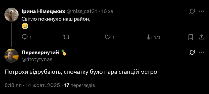 «На проспекті Науки немає світла, також не працює вуличне освітлення. Світло увімкнули на хвилину й потім знову вирубили», – уточнює кореспондентка Віледжа. Також фіксують перебої зі зв’язком.