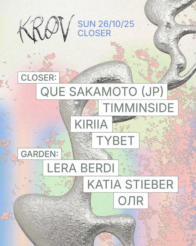 Електронний музикант із Токіо Que Sakamoto зіграє сет із диско, геріджа та брейкбіта у клубі Closer. Разом із ним у лайнапі Timminside, Kiriia, Tybet, а також Lera Berdi, Katia Stieber та «ОЛR», які займуть сцену в саду. Вхід для військових – безплатний.