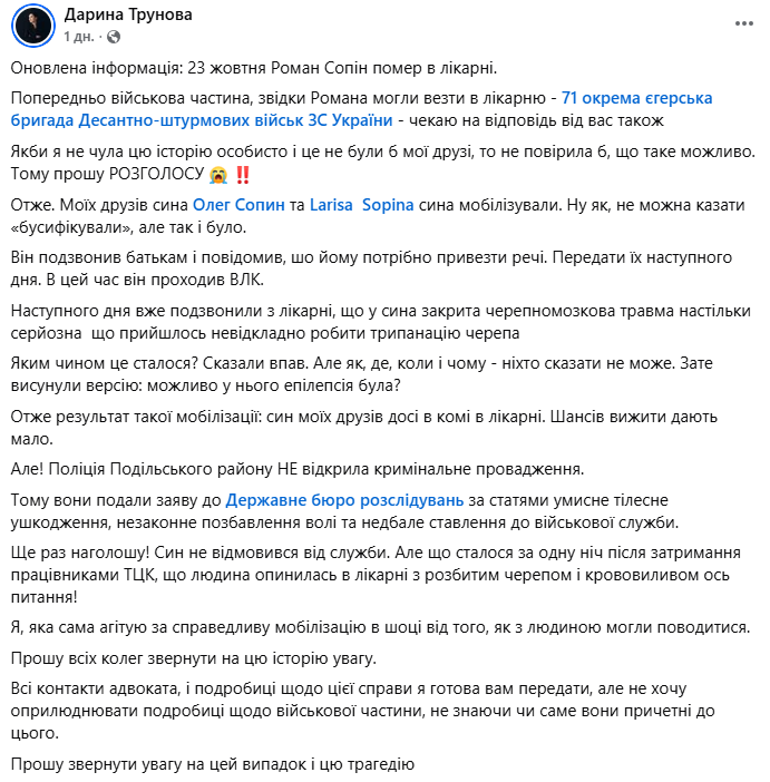 “Отже. Сина моїх друзів Олега та Лариси Сопіних мобілізували. Ну як, не можна казати «бусифікували», але так і було. Він подзвонив батькам і повідомив, що йому потрібно привезти речі. Передати їх наступного дня. В цей час він проходив ВЛК. Наступного дня вже подзвонили з лікарні, що у сина закрита черепно-мозкова травма настільки серйозна, що прийшлось невідкладно робити трепанацію черепа. Яким чином це сталося? Сказали впав. Але як, де, коли і чому – ніхто сказати не може. Зате висунули версію: можливо у нього епілепсія була”, – розповіла ведуча.