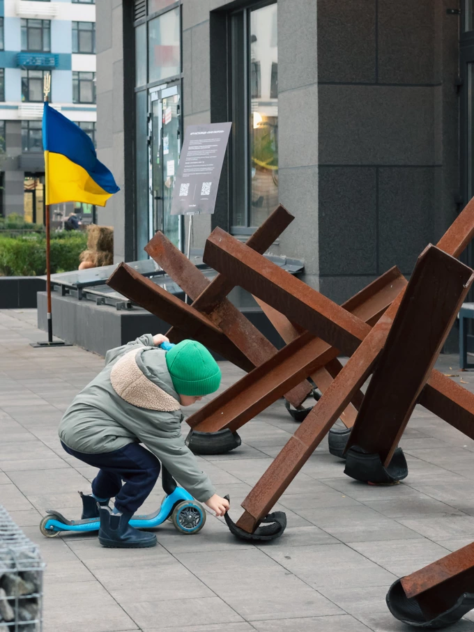 На майданчиках закладів розташували протитанкові їжаки, які обороняли Київ і Київську область від початку повномасштабного вторгнення.