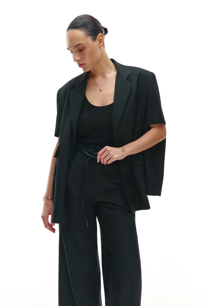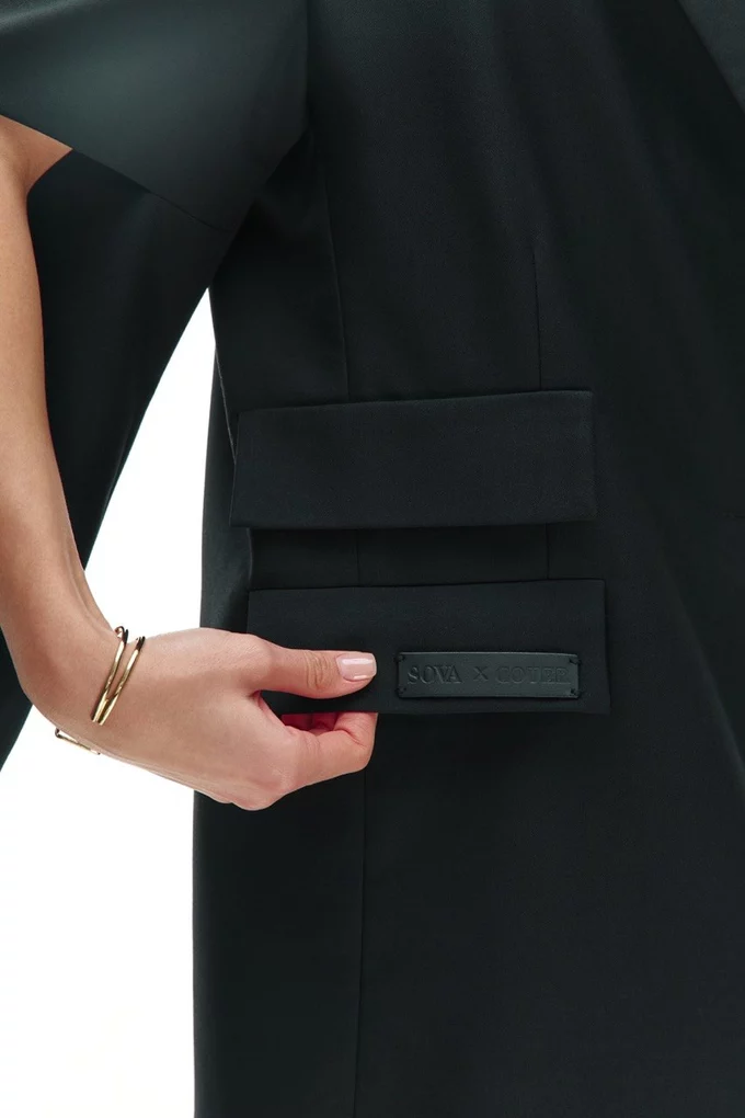 Основою нового образу став один зі впізнаваних костюмів бренду COVER, адаптований спеціально для ювелірних стилістів SOVA. Лаконічний костюм чорного кольору складається з маскулінного блейзера з розрізами на рукавах і класичних штанів. Комплект передає спільну естетику обох брендів – мінімалізм, трендові та чіткі форми.