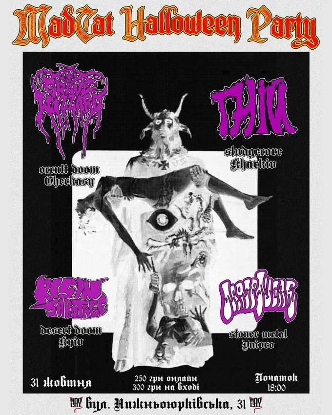 На гелловінській вечірці в артклубі Mad Cat на Нижньоюрківській виступатимуть гурти Gniy, Grave Wizzzard, Rising Sabotage та Space Sugar.