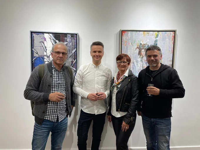 Мирослав Дузінкевич (другий зліва) на персональній виставці в галереї Kate Oh Gallery на Мангеттені. Поруч Орест Паробок (зліва), Оксана Нагорнова, Роман Листвак. Мирослав Дузінкевич
