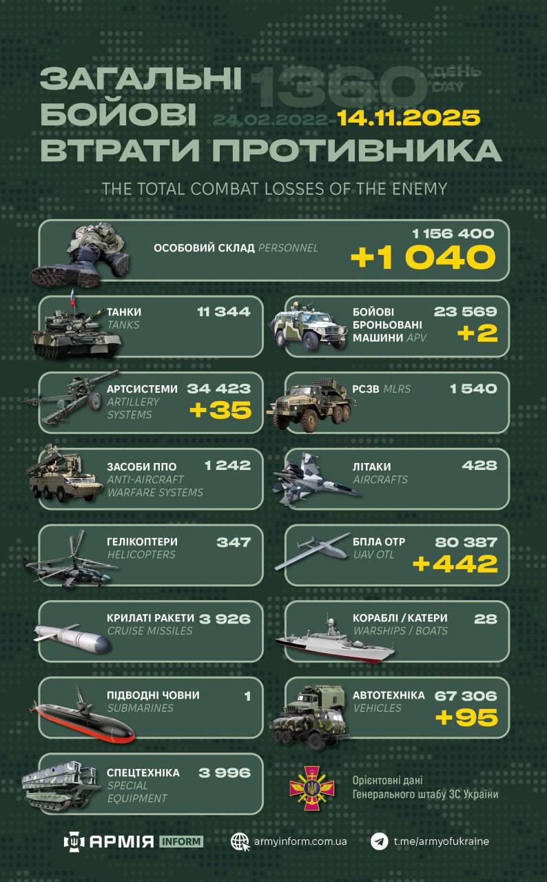 Загальні бойові втрати противника з 24.02.22 по 14.11.25 орієнтовно становили: