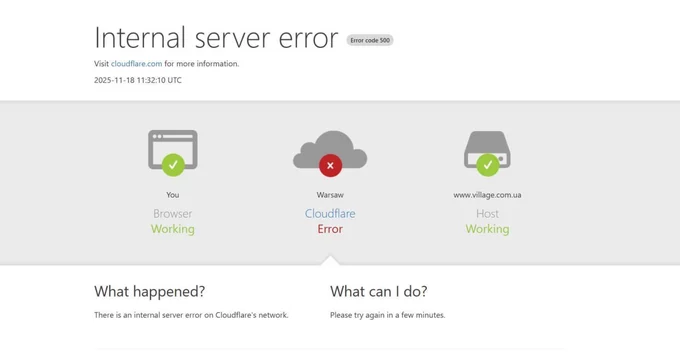 Джерело: Більшість вебсайтів, зокрема й Віледж, працюють із перебоями через збій у роботі Cloudflare