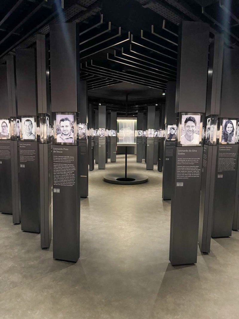 Не доходячи до середини шляху, в Меморіалі відкриваються три простори. Один ліворуч і два праворуч. Ліворуч — пам’ять. Праворуч — свідчення та священне місце, де зберігають віднайдені останки жертв. У просторі пам’яті родини вшановують своїх близьких: там розміщені їхні портрети, дорогі їм речі; емоції співпереживання підсилює зворушлива музика бразильського композитора Берни Сеппаса. У просторі свідчень трагічна історія повторюється знову і знову за допомогою відеозаписів з камер відеоспостереження компанії. Вони зафіксували майже всі ракурси жахливих подій, що розгорнулися того дня. Уздовж дороги пам’яті течуть два потоки, які зрештою зливаються, перш ніж упасти в меморіальне озеро. Нахилена під кутом квадратна конструкція символізує руйнівний дисбаланс людського втручання в навколишній ландшафт, катастрофічні наслідки зазіхання на природу, нехтування повагою до неї. Ціна цих дій — життя.