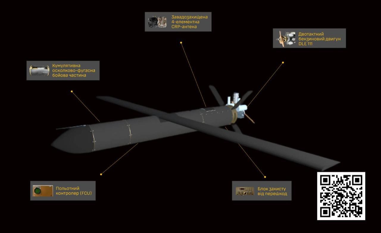 «Силова установка представлена китайським двотактним бензиновим двигуном DLE 111. Подібні малолітражні двигуни вже неодноразово фіксувалися у складі російських БПЛА „гєрбєра“, „БМ-35“, „пародія“ та „дельта“. Враховуючи обсяг паливного бака — 28 літрів — дальність застосування Shahed-107 становить близько 300 км», — заявили в ГУР МОУ.