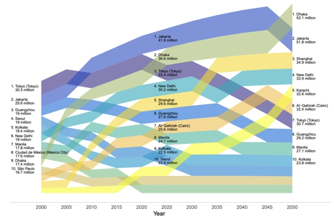 Загалом із 2000 до 2025 року чисельність населення міст у світі зросла на 1,25 мільярда, але більше ніж половина цього приросту припадає лише на кілька країн. Індія, Китай, Нігерія, Пакистан і Сполучені Штати Америки разом додали понад 500 мільйонів людей до світового міського населення.