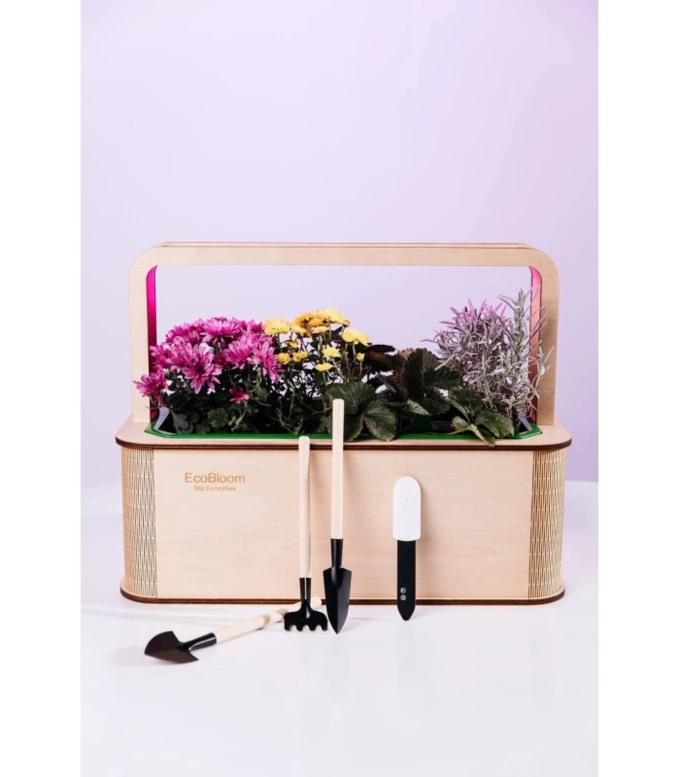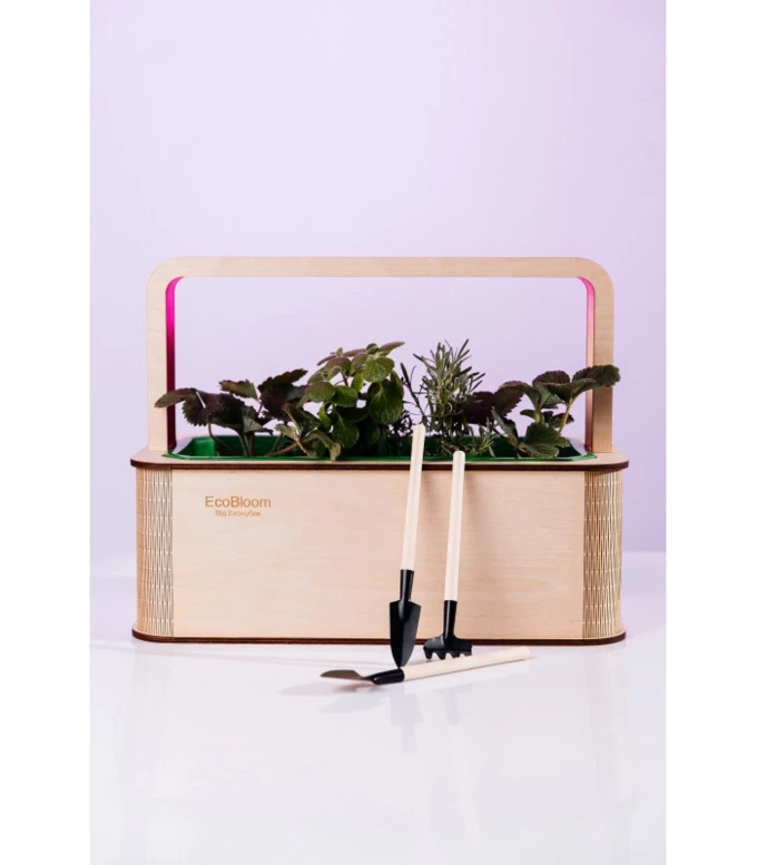 Набір включає багаторазовий дерев’яний «кошик», спеціальну фітолампу, датчик вологості, лоток для ґрунту, сам ґрунт і насіння, а також лопатки й граблі. Пропонують варіанти для вирощування овочів, квітів, мікрогріну, трави й чайних рослин.