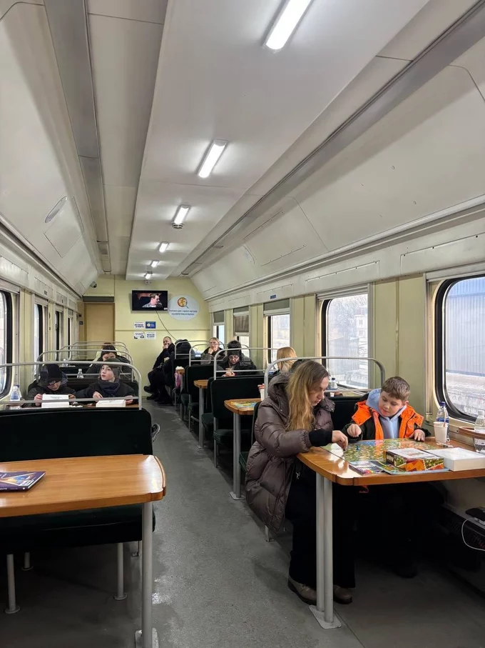 У вагонах можна зігрітися, зарядити гаджети, приєднатися до інтернету від Starlink і безкоштовно випити чаю. Для дітей у вагонах підготували мультики, ігри, розмальовки, книжки та настільні ігри. А для домашніх улюбленців смаколики у пет-френдлі купе.