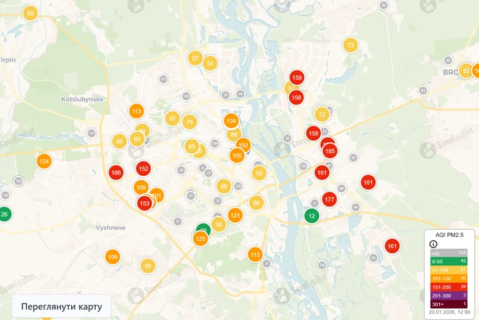 Найгірша ситуація на лівому березі Києва – там показники забрудненості повітря сягають значень 158–185, що свідчить про «шкідливий рівень». Показники в межах «шкідливого рівня» також фіксують у межах Софіївської та Петропавлівської Борщагівок, Гореничах і Борисполі.