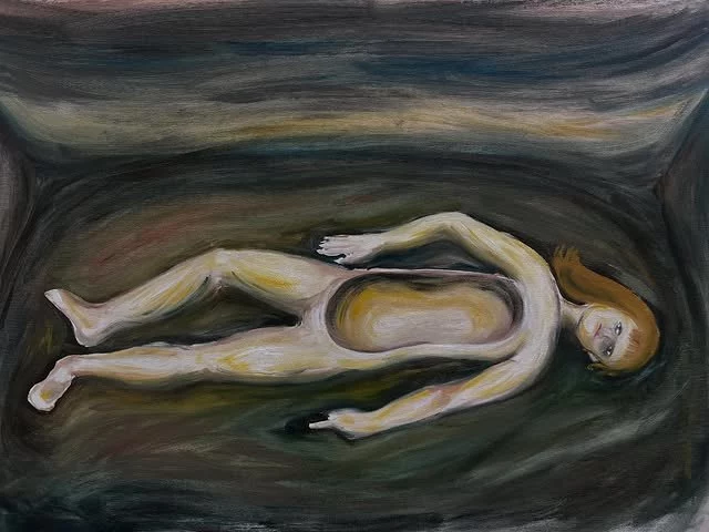 Оля Єрємєєва почала створювати живопис зовсім нещодавно. Кути кімнат, які вона малює, кровоточать, та її роботи не жахають цією кров’ю. Жах цих робіт полягає в тому, як він легко входить до людських осель і мімікрує під побутові речі; як люди звикають до війни чи втрат. Війна знеособлює багато речей, але робить досвід надзвичайно тілесним – коли ламаються дерева, ламаються тіла.