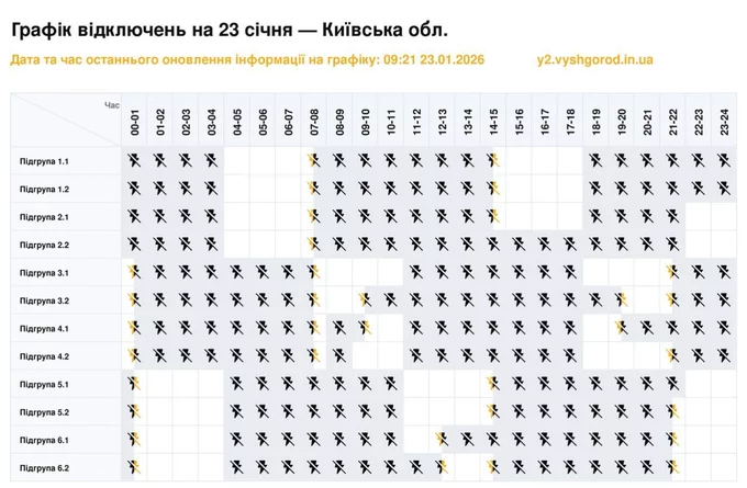 Востаннє графіки для Київщини компанія публікувала 15 січня. Тоді світла не було від 12 до понад 16 годин на день. Проте у деяких районах екстрені графіки діяли ще з 27 грудня 2025 року – через атаку росіян по енергетиці.