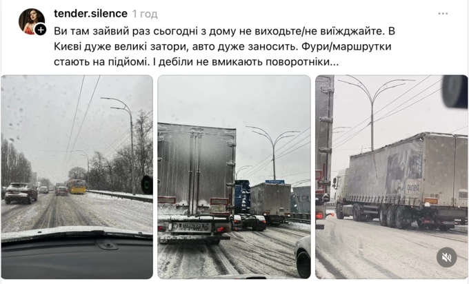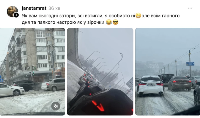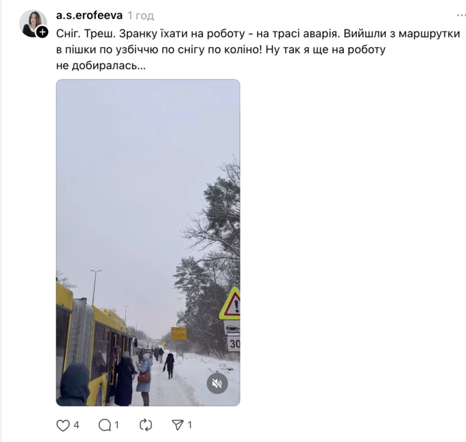Користувачі Threads також скаржаться на затори й діляться фото та відео. Через сніг на дорогах заносить автівки, а на трасі сталася аварія. У результаті люди були змушені вийти з автобуса.
