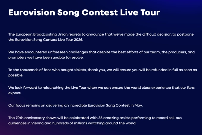 Європейська мовна спілка зіткнулася з «непередбаченими проблемами», які не змогла вирішити. Шанувальникам, які вже придбали квитки, повернуть кошти, а Live Tour відновлять, коли команда зможе «забезпечити світовий рівень, якого очікують фанати».