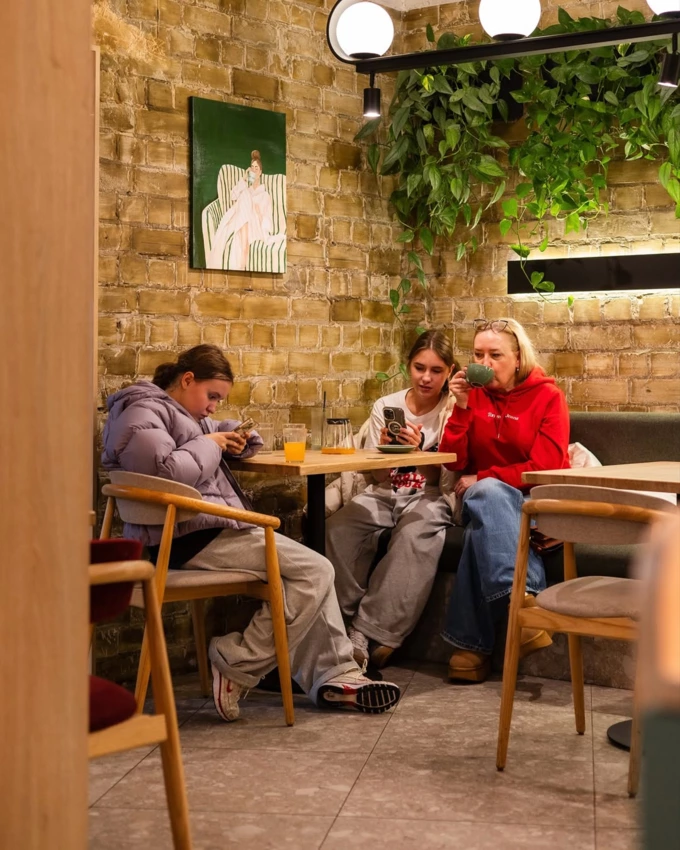 У кафе три окремі зали: музична з аудіосистемою і вінілом, мистецька з роботами сучасних українських художників і бібліотека з рідкісними книгами й артбуками.