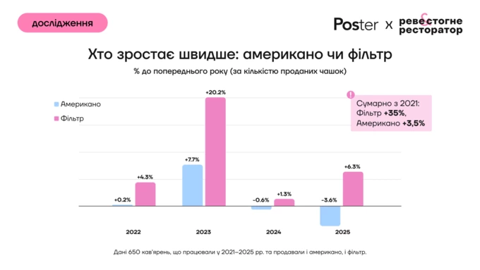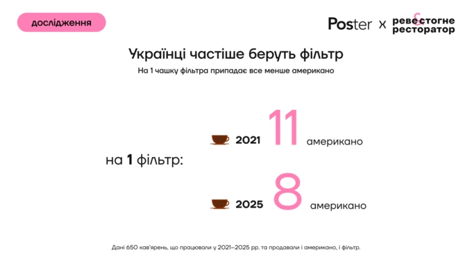 Аналіз компанії Poster ґрунтується на даних продажів 650 кав’ярень по всій Україні, які працювали з 2021 по 2025 рік і продавали як американо, так і фільтр-каву. У дослідженні порівнювали саме машинний фільтр, ручний не враховували.