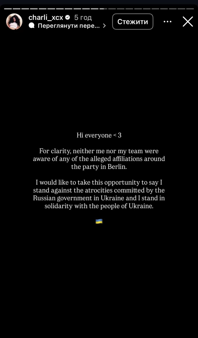 Британська співачка Charli XCX заявила, що «не знала про російські зв’язки організаторів афтепаті вечірки», яка відбулася після Берлінського кінофестивалю.