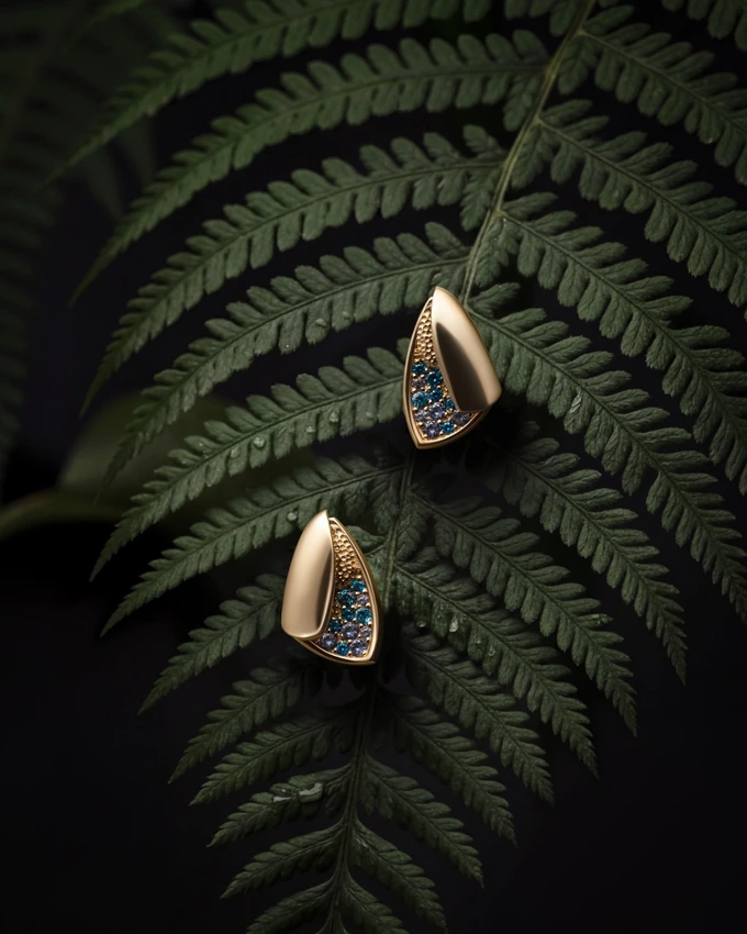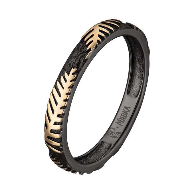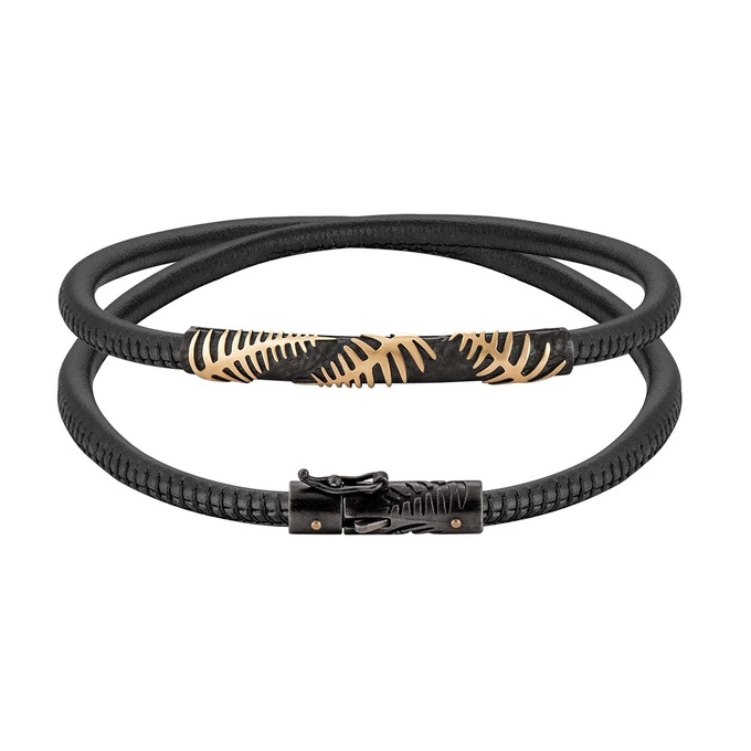 Темну, загадкову сторону міфу прикраси розкривають завдяки образу Папороті. Золоте листя виступає на глибокому темному тлі з рельєфною текстурою. Цього ефекту ювеліри досягли завдяки покриттю золота рутенієм – воно створює відчуття глибини та підсилює контраст із жовтим металом, тому папороть здається об’ємною. У колекції це графічні унісекс-прикраси: кафи, сережки та чокер зі шкіряною основою, який можна стилізувати як браслет.
