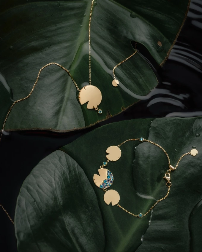 Образ Латаття відсилає до Темного озера – повноцінного персонажа фільму, який приховує власні таємниці й водночас є оселею та природним середовищем існування міфічних істот. Прикраси виконані із жовтого золота та відтворюють м’яку, округлу форму пелюсток латаття. Цей мотив повторюється в різних розмірах у каблучках, моносережках, підвісах, кольє та браслетах. Частина прикрас має гладкий золотий фініш, а інші – оздоблені розсипом блакитних і бірюзових камінців, що створюють відчуття руху крапель і світла на поверхні води.