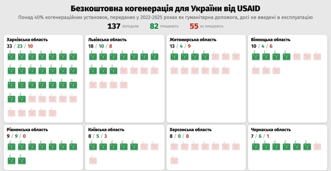 Із 16 областей лише чотири повністю ввели в експлуатацію когенераційні установки. Ідеться про Рівненську (дев’ять установок), Миколаївську (шість установок), Донецьку (дві установки) та Одеську (одна установка). Водночас у Херсонській області досі не працює жодна із восьми переданих міні-ТЕЦ.