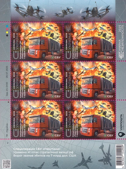 Марку «Спецоперація СБУ «Павутина» презентували до 34-ї річниці Незалежності України. Вона присвячена операції, у межах якої СБУ знищила 41 літак стратегічної авіації Росії.
