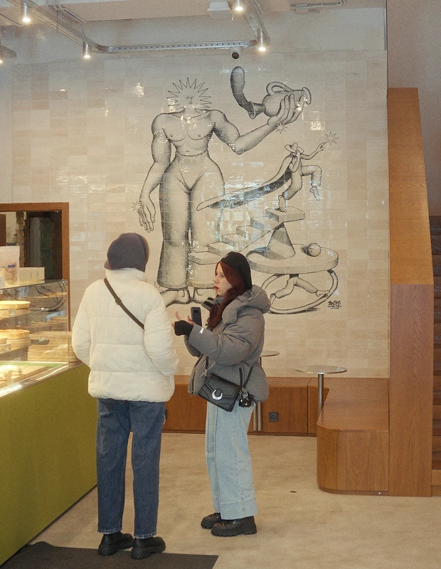 Київський художник-мураліст Володимир Манжос (WaOne Interesni Kazki) оформив стіну закладу O’Cake на Сагайдачного керамічним панно, повідомили Віледжу в команді.