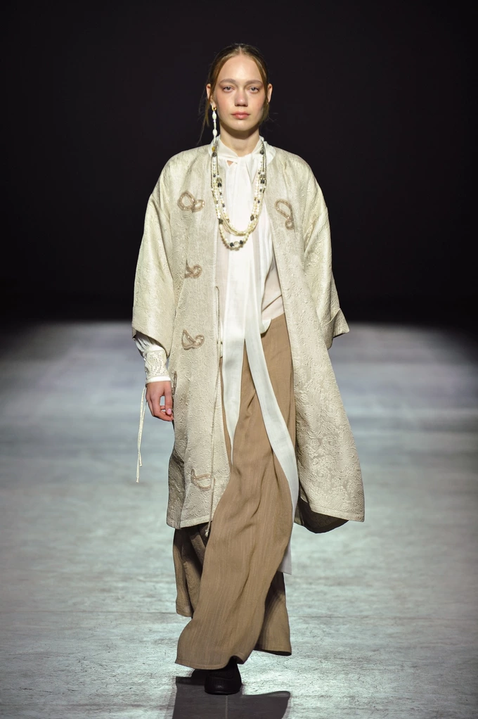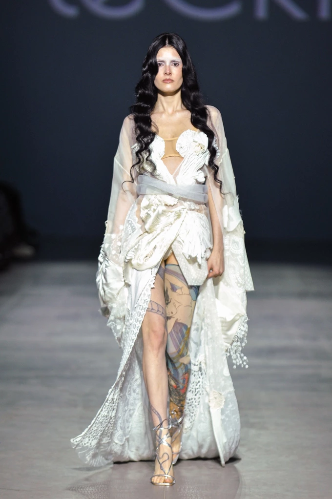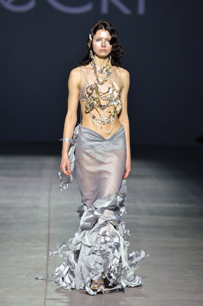 Фантазія дизайнерки бренду Lecri ринула до професійних японських пірнальниць ама. Це жінки, які занурювалися у воду в пошуках молюсків, перлів і морських водоростей. Історія ама сягає понад 2000 років і вражає жіночою силою, містицизмом і духовною глибиною. Саме цю філософію передали Lecri в напівпрозорих сукнях із мереживом і сіткою, довгих накидках із плісируванням та аплікацією, рваних подолах спідниць, що нагадують морську піну. Гармонія з морським світом, новий погляд на жіночу силу й продовження роботи з апсайклінгом – ті теми, що прагнули відтворити Lecri.