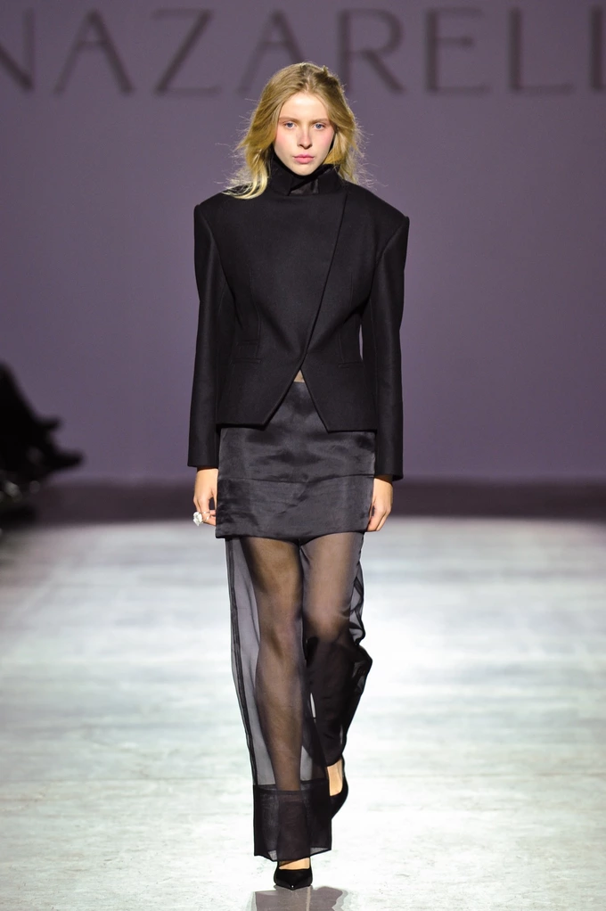 Бренд Nazarelli втілив це у стриманих силуетах з яскравими акцентами, показуючи зовнішню силу та внутрішню емоційність водночас. Це були колірні вставки на жакетах, прозорі елементи на класичних штанах чи делікатні розрізи на строгих спідницях.