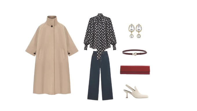 Як базу можна взяти улюблені джинси, що рятують у будь-якій ситуації, і поєднати їх зі принтованою блузкою. Блузка із завуженими рукавами, що виднітимуться з-під тренча, додасть луку завершеності. Додаємо підбори і яскравий акцент у вигляді червоного клатча, що контрастує із загальним монохромом. Якщо туфлі на підборах – не зовсім буденний вибір, їх завжди можна замінити на мінімалістичні балетки чи мʼякі лофери.