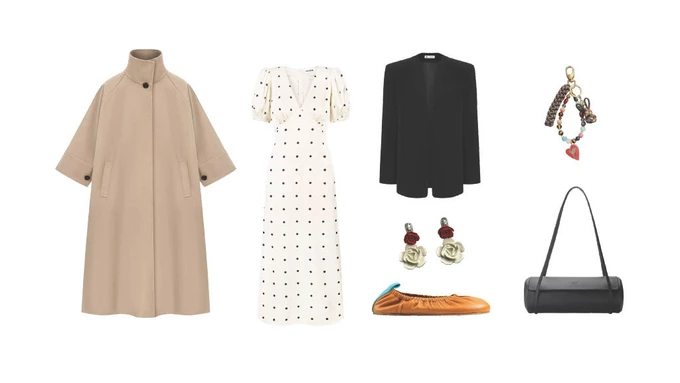 Балетки – найлегший спосіб спростити лук із сукнею й жакетом. Горошок – ще одна тенденція сезону весна/літо 2026, тож його можна знайти в асортименті половини українських брендів. Стриману сумку й верхній одяг точково розбавляємо прикрасами в інфантильному стилі та взуттям як колірною інʼєкцією.