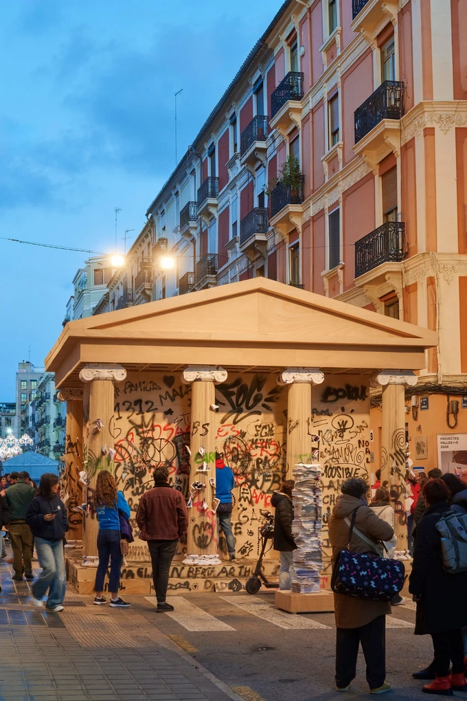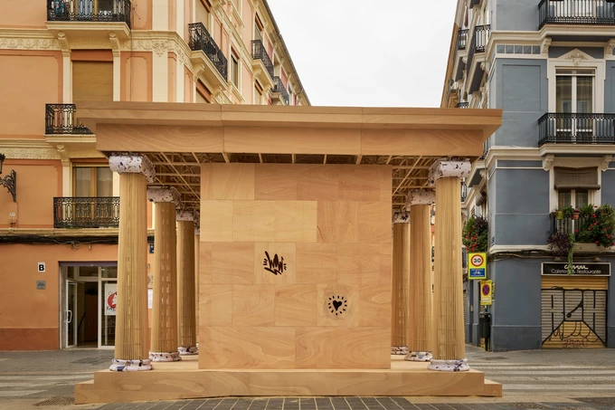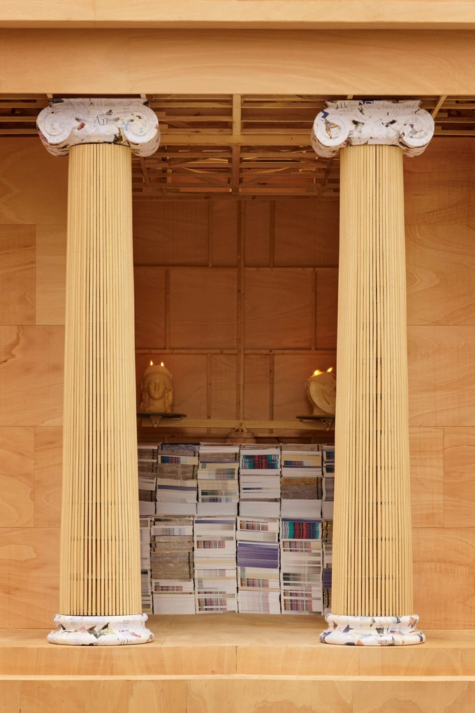 Художня студія PichiAvo створила інсталяцію «Пер Офренар» у вигляді давньоримського храму з дерева та паперу, пише Dezeen.