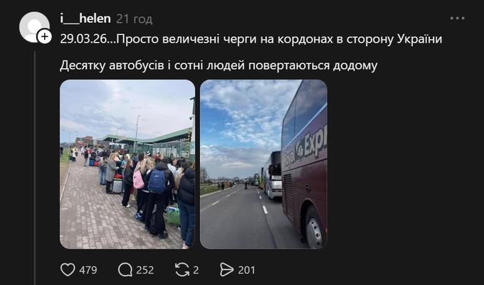 У Threads пишуть, що «пройшли кордон за 3 години», хоча пункти пропуску не вказують. Водночас на менш завантаженому «Грушів – Будомєж» люди стояли понад десять годин у черзі.