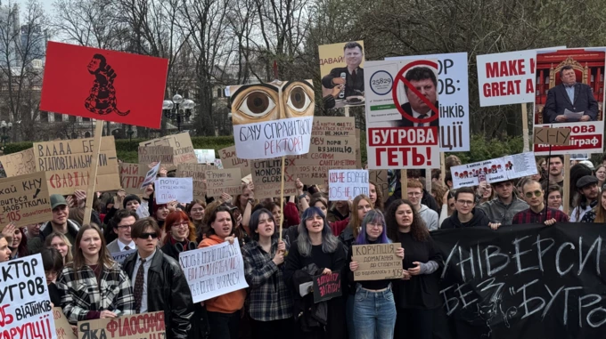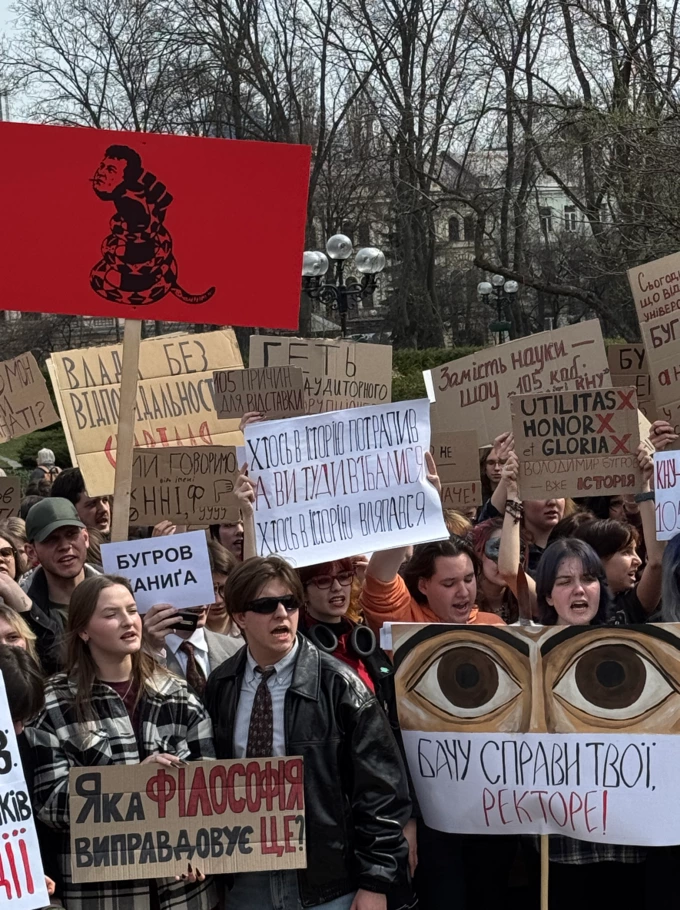 Студенти КНУ імені Тараса Шевченка вийшли на акцію протесту проти нинішнього ректора Михайла Бугрова під стіни червоного корпусу університету.