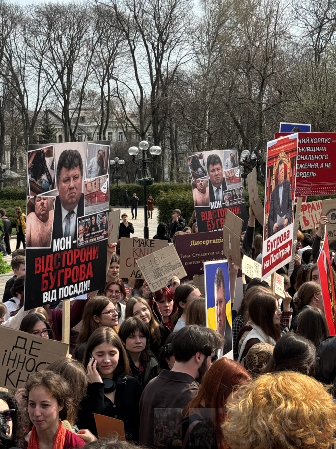 Усього прийшло приблизно 150 людей. Деякі з них принесли плакати із закликами відправити Бугрова у відставку. Це сталося після того, як в анонімному телеграм каналі [наразі видалений] з’явилися інтимні фото та відео, нібито, з авдиторії університету та з людиною, котра схожа на ректора.