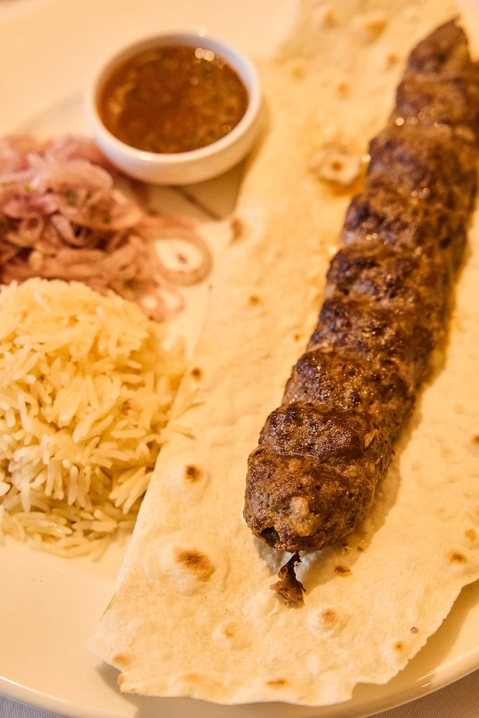 Меню на лівому березі повністю ідентичне до інших закладів мережі «Мусафір». Тут дотримуються принципу використання халяльного м’яса та єдиних технологічних карт страв, що готують у мережі. За процесами на кухні стежить шеф-кухар закладу (у кожному «Мусафірі» він свій), а контроль якості здійснює загальномережевий технолог. Флагманськими позиціями залишаються чебуреки, янтики та плов, а завдяки тому, що є дров’яна піч, акцент роблять на піде.