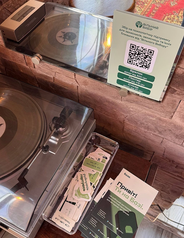 У кав’ярні можна придбати за донат стікери, постери та брелоки від ГО «Вільний вибір», які займаються психологічною підтримкою ветеранів.