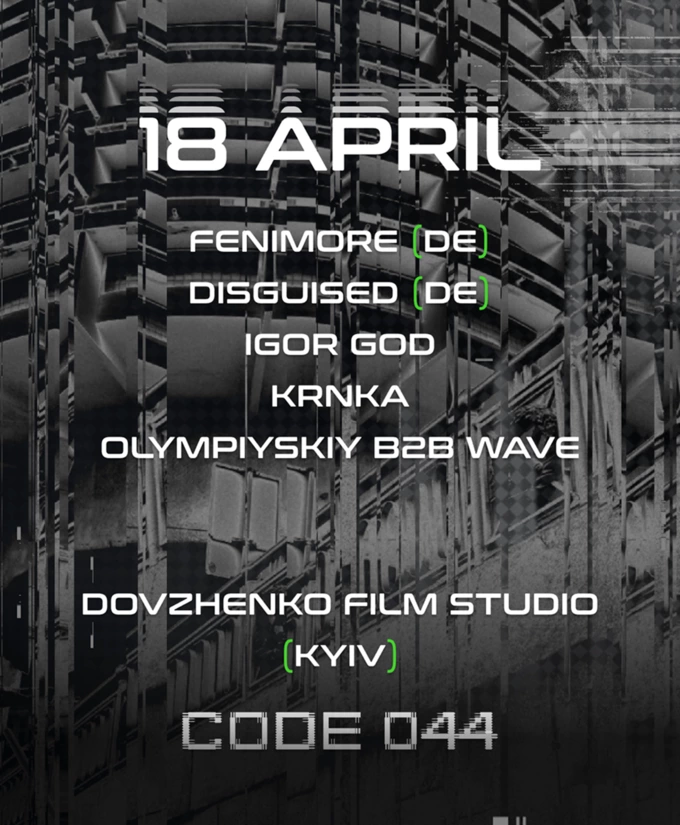 На кіностудії Довженка відбудеться вечірка електронної музики від формації Code044. У лайнапі німецькі диджеї Fenim0re та Disguised, а також локальні музиканти: Igor God, Krnka й Olympiyskiy b2b Wave. Карта локації, правила заходу та дрескод – тут.