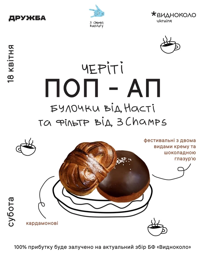У меню – фільтр-кава на зерні від 3 Champs Roastery, а також кардамонові та фестивальні булочки з кремом і шоколадною глазурʼю. Усі вторговані кошти організатори спрямують на актуальний збір благодійників із «Виднокола».