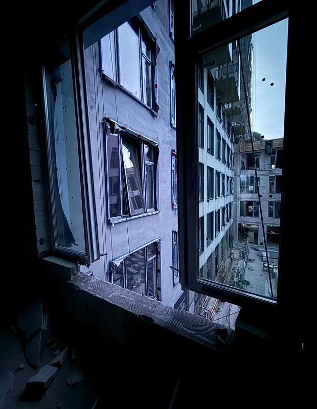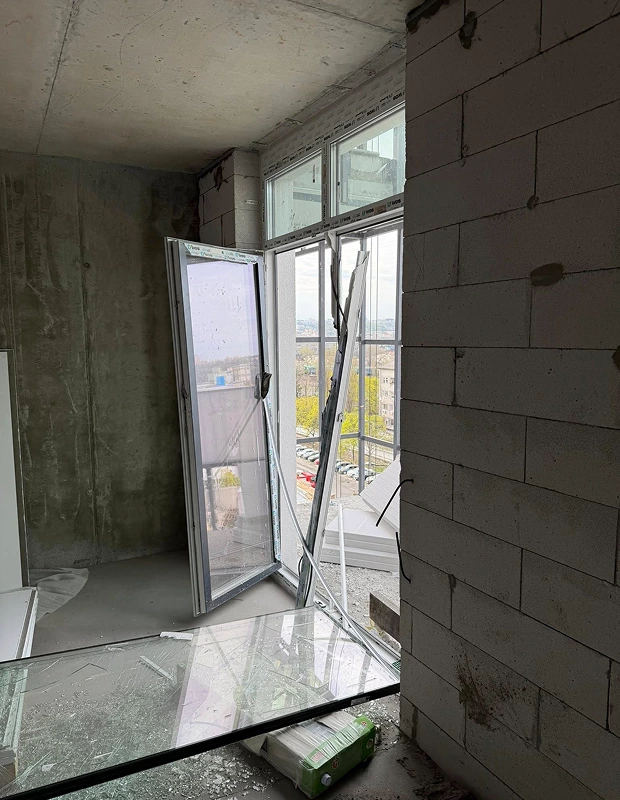 Основну ударну хвилю прийняв на себе будівельний контейнер, також пошкоджена техніка і будівельний майданчик, каже девелопер. У самому ЖК вибиті вікна і фасадні елементи, пошкоджені внутрішні приміщення.