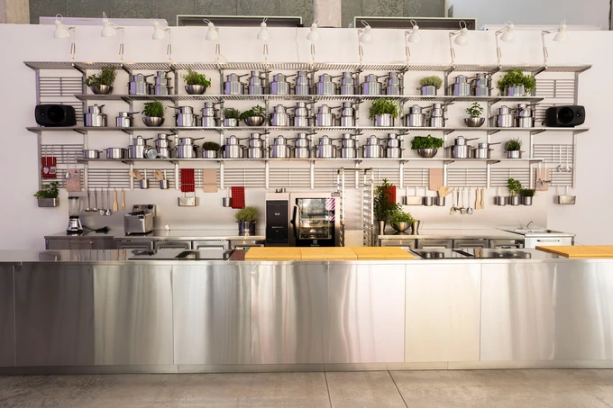 Окрім кімнат, на виставці облаштували внутрішній дворик у стилі шведських продовольчих ринків, а також кафе, яке обрамили фірмовими книжковими шафами бренду.