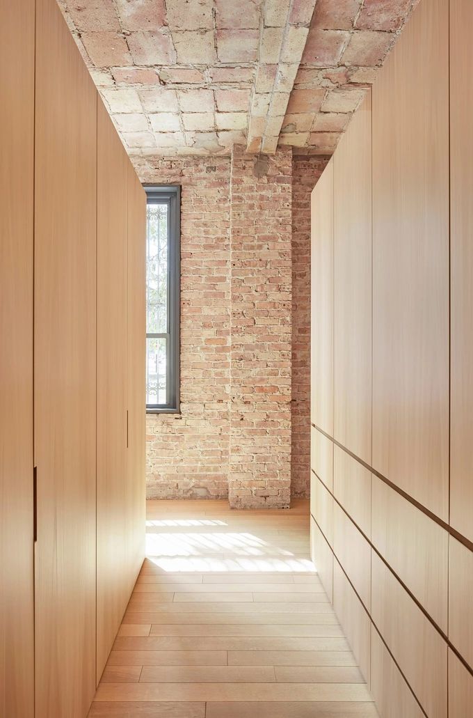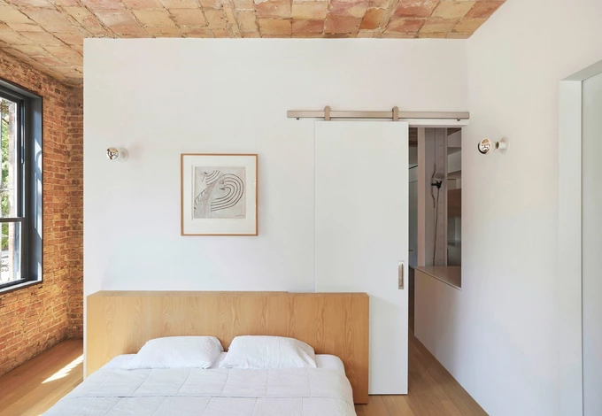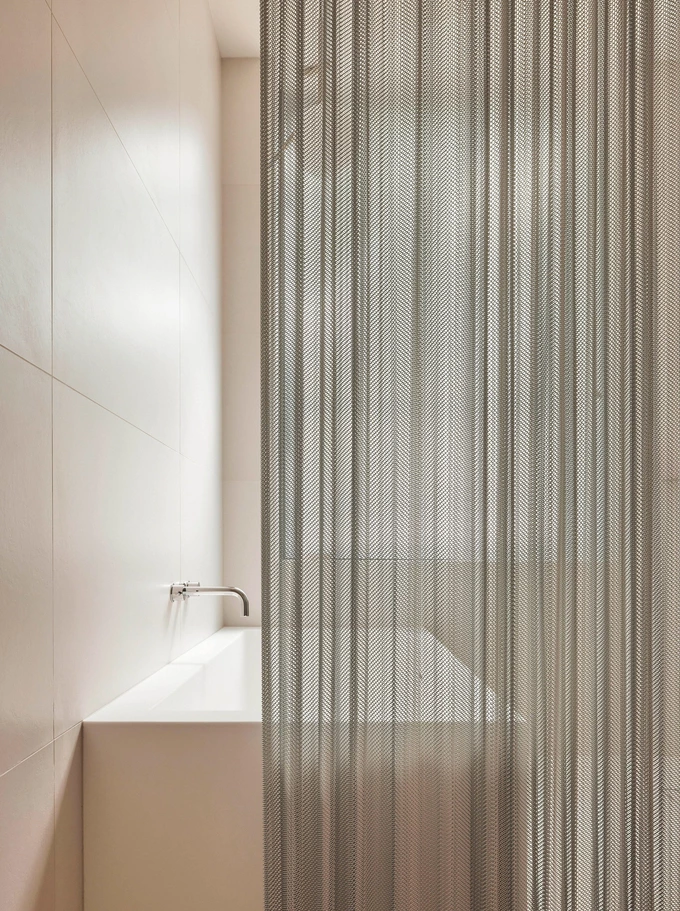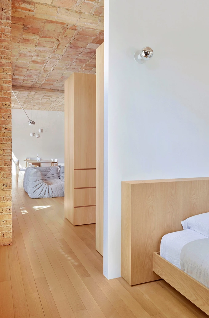 Вітальню та спальню розділили двома рядами невисоких шаф із білого дуба. Світле дерево також використали для підлоги у всьому приміщенні. Головну ванну кімнату відокремили у вигляді білого блоку, а душову зону всередині неї відмежували від решти простору розсувною шторкою з металевої кольчуги.