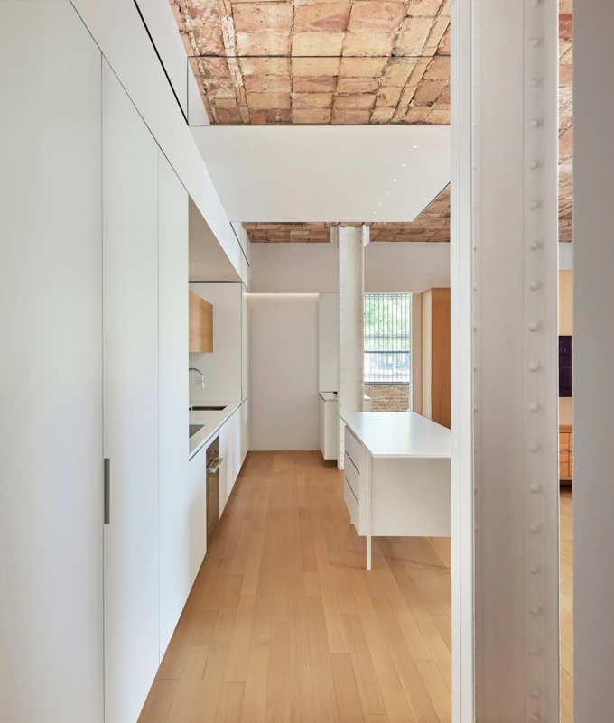 Простір перепланували так, щоб забезпечити максимальне проникнення природного світла. Уздовж північної стіни, у найтемнішій зоні, змонтували суцільну поверхню, яка об’єднує кухню, пральню та комору. Над кухонним островом встановили дзеркальну підвісну стелю, яка приховує старі сантехнічні стояки.
