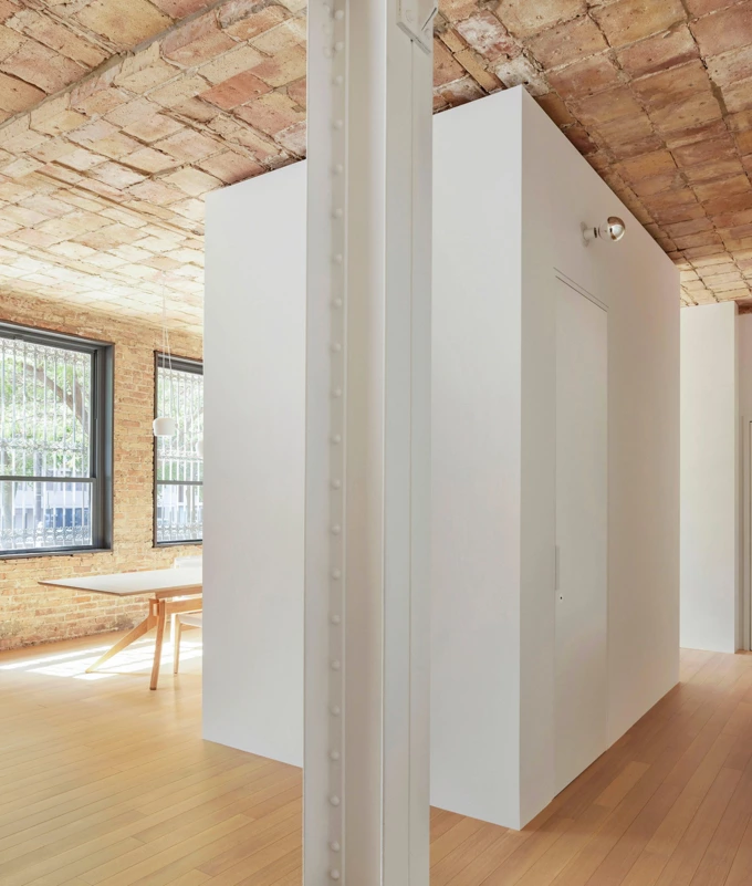 Натомість сталеві опорні колони пофарбували в білий колір, щоб вони візуально зливалися з новими внутрішніми перегородками.